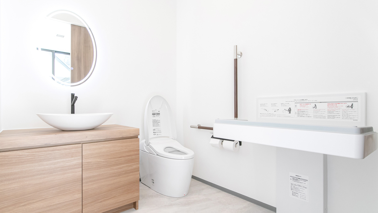 トイレにはオムツの交換台を設置しています。トイレ内は広く、ベビーカーや車椅子でも入室できます。