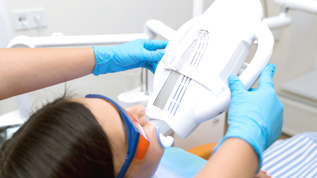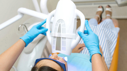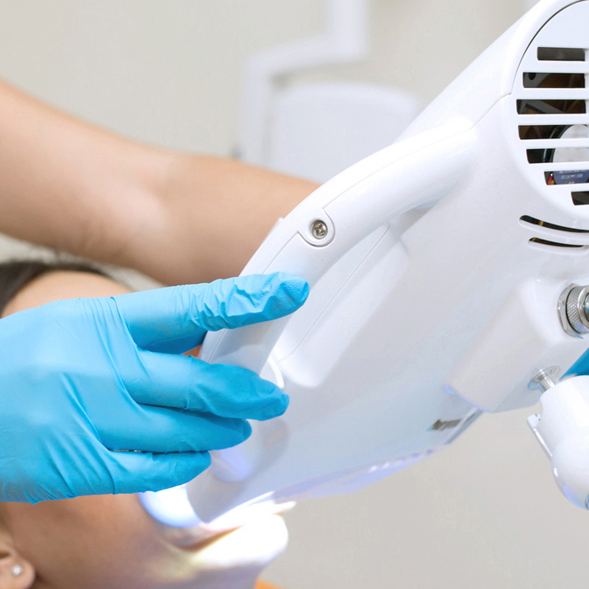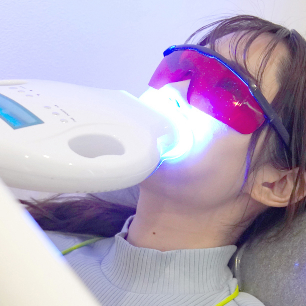 歯科医院内で行うホワイトニングです。歯の表面に薬剤を塗り、光を照射して歯を白くします。