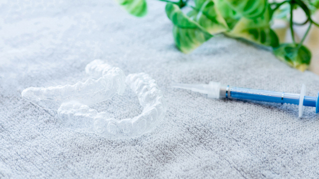 自宅で行うホワイトニングです。患者さま専用のマウスピースを歯科医院で作り、自宅にてマウスピースにホワイトニングの薬剤を流し込んで数時間装着します。白くなるまでに時間を要しますが、元の歯の色に戻ってしまう「後戻り」が少ないメリットがあります。